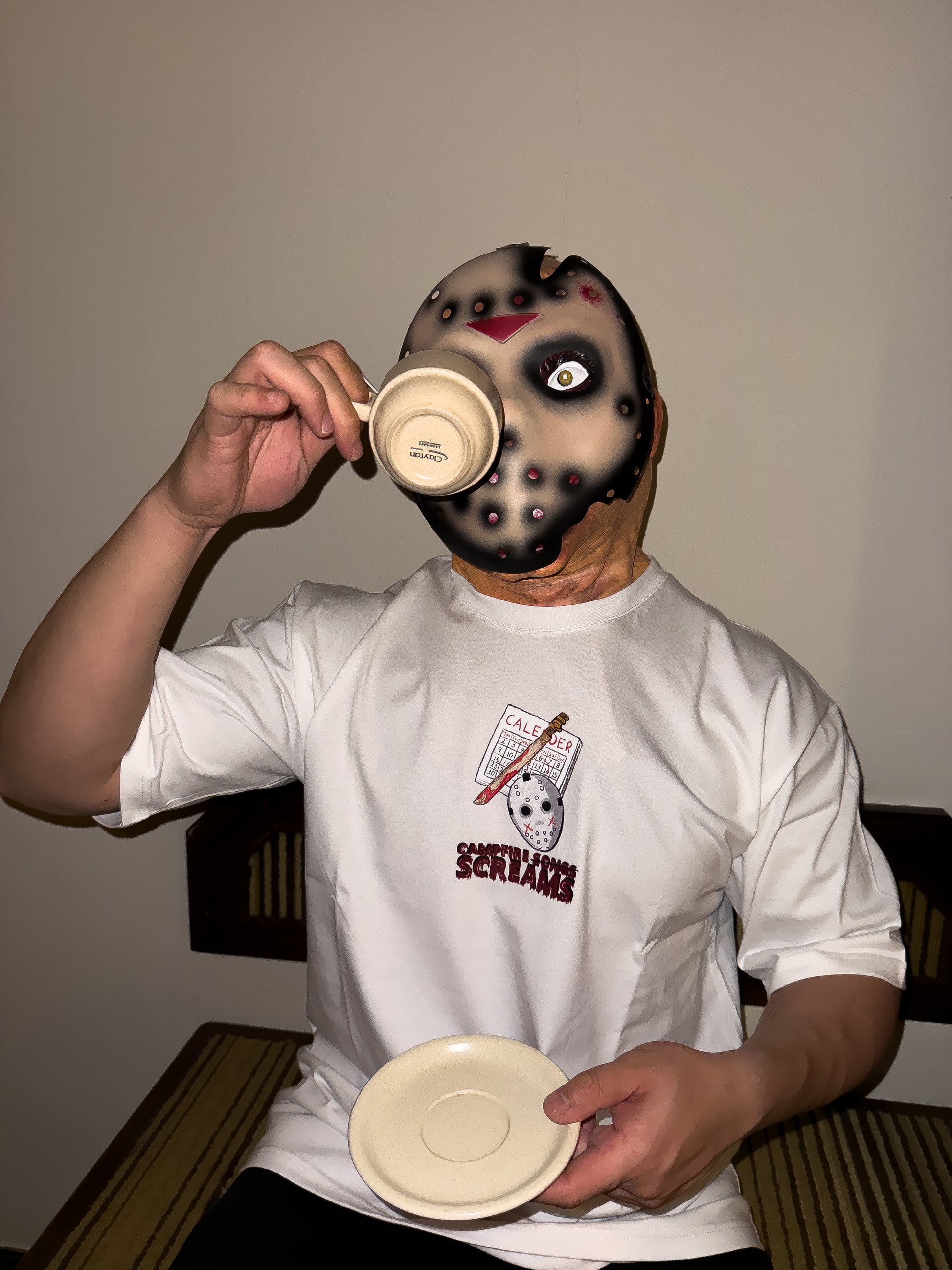 Our crayon-stroke design brings this legendary slasher to life—spooky enough to haunt your closet, playful enough to make friends nervously laugh while checking the cabin corners.